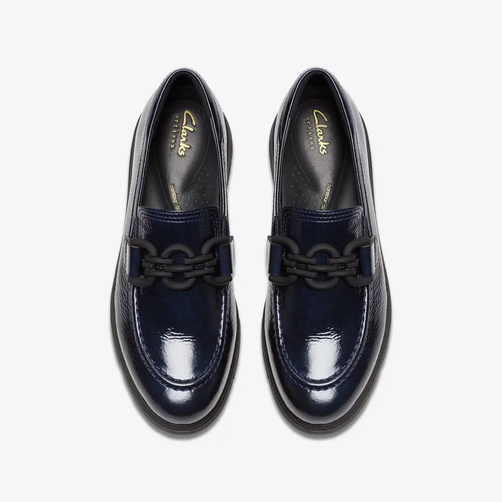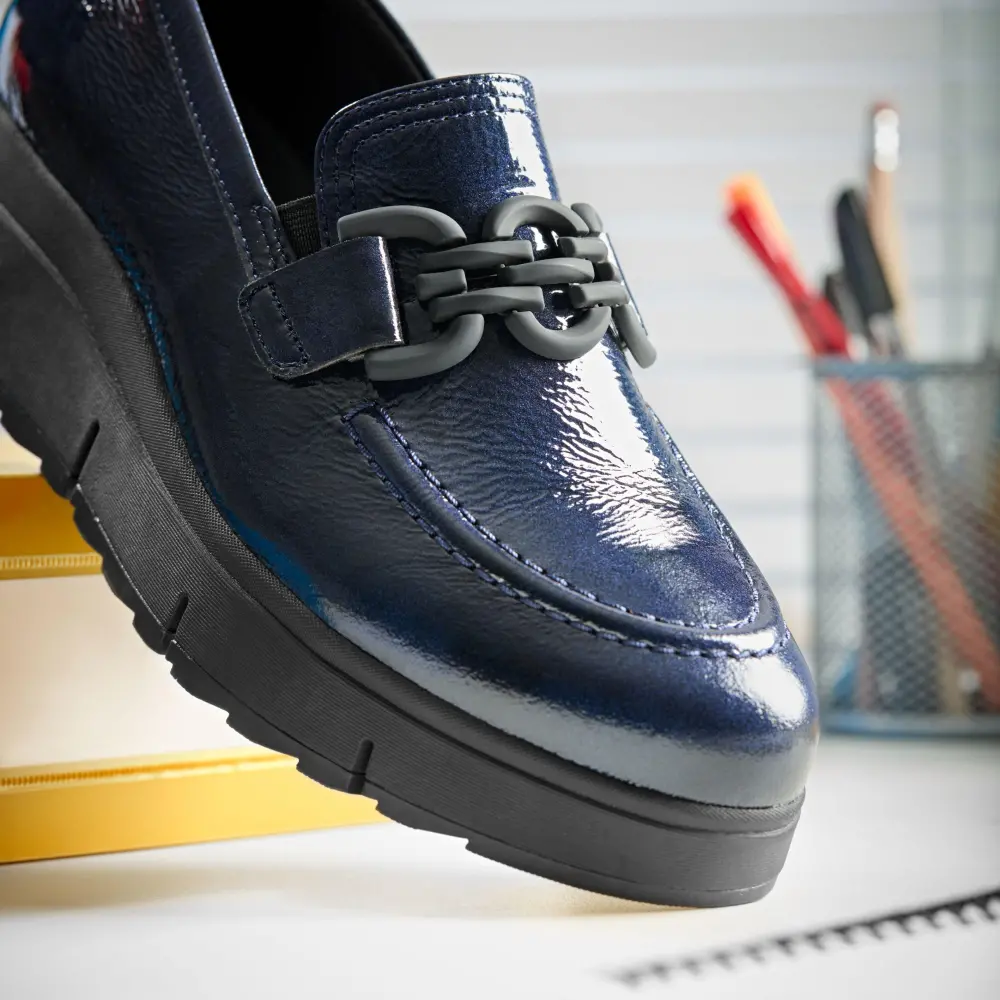 Bold shoes mean business, and our Loriini Izzy leather slip on is perfect for work and after-hours alike. Set atop a chunky wedge heel with flex grooved soles for ultimate stability, it makes use of our signature Contour Cushion footbeds to move you forward in total comfort. An almond toe shape and sleek metal trim bring a contemporary finish to this staple.