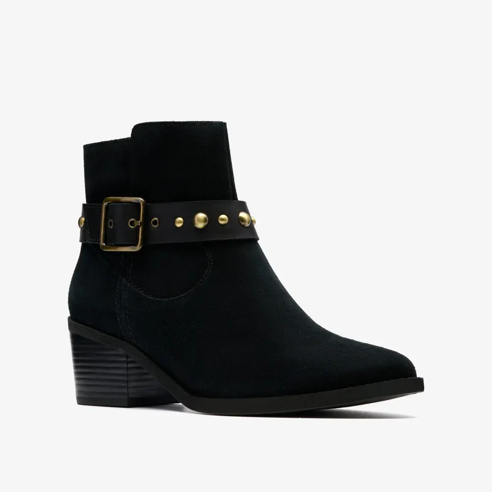 Ankle boot Morzine Buckle lands in soft black suedes for a classic, premium look. We’ve completed the pair with authentic top stitching, gold-tone buckles and a super-soft footbed for total comfort and a polished aesthetic. And , offering easy-walk support that powers every move, it’s all tied together with an ultra-wearable stacked heel.
