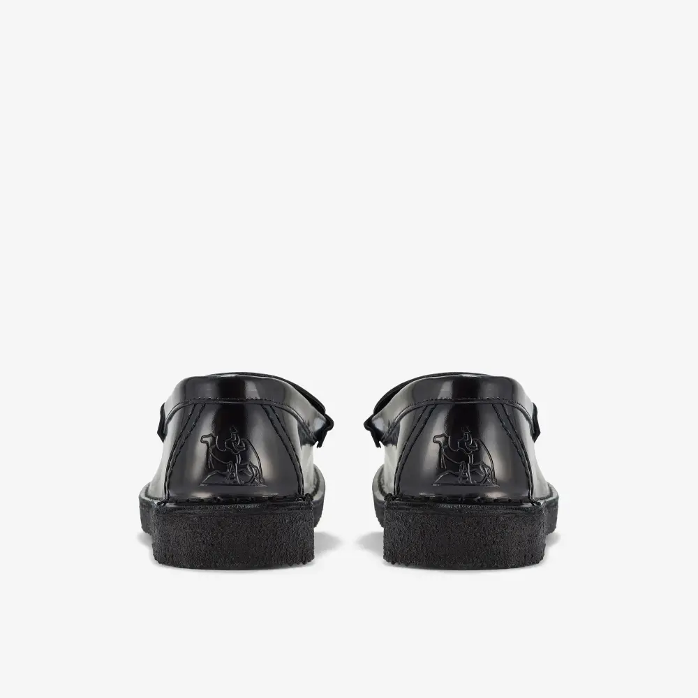 Available in black patent leather upper atop a black pebble crepe sole.
